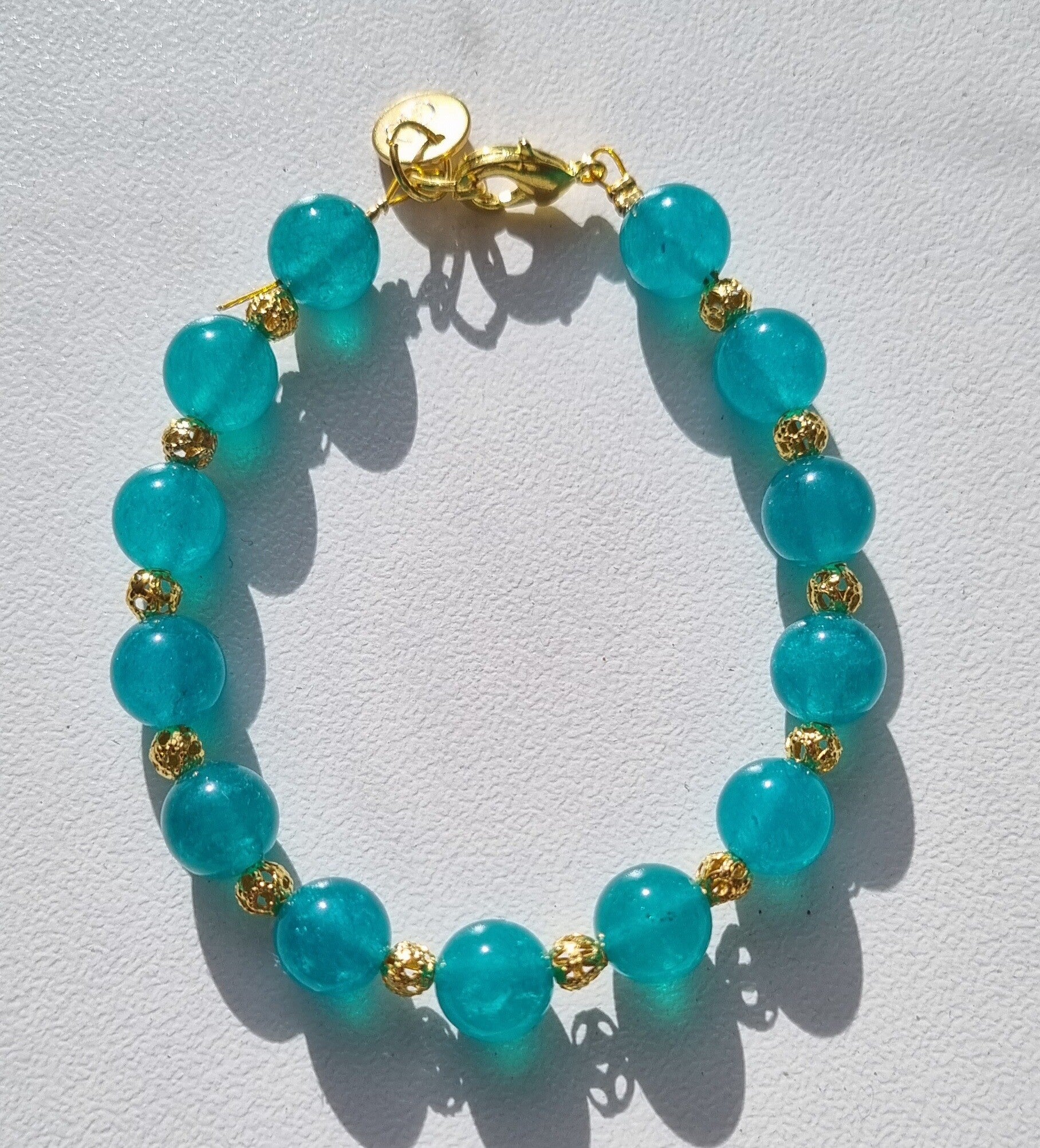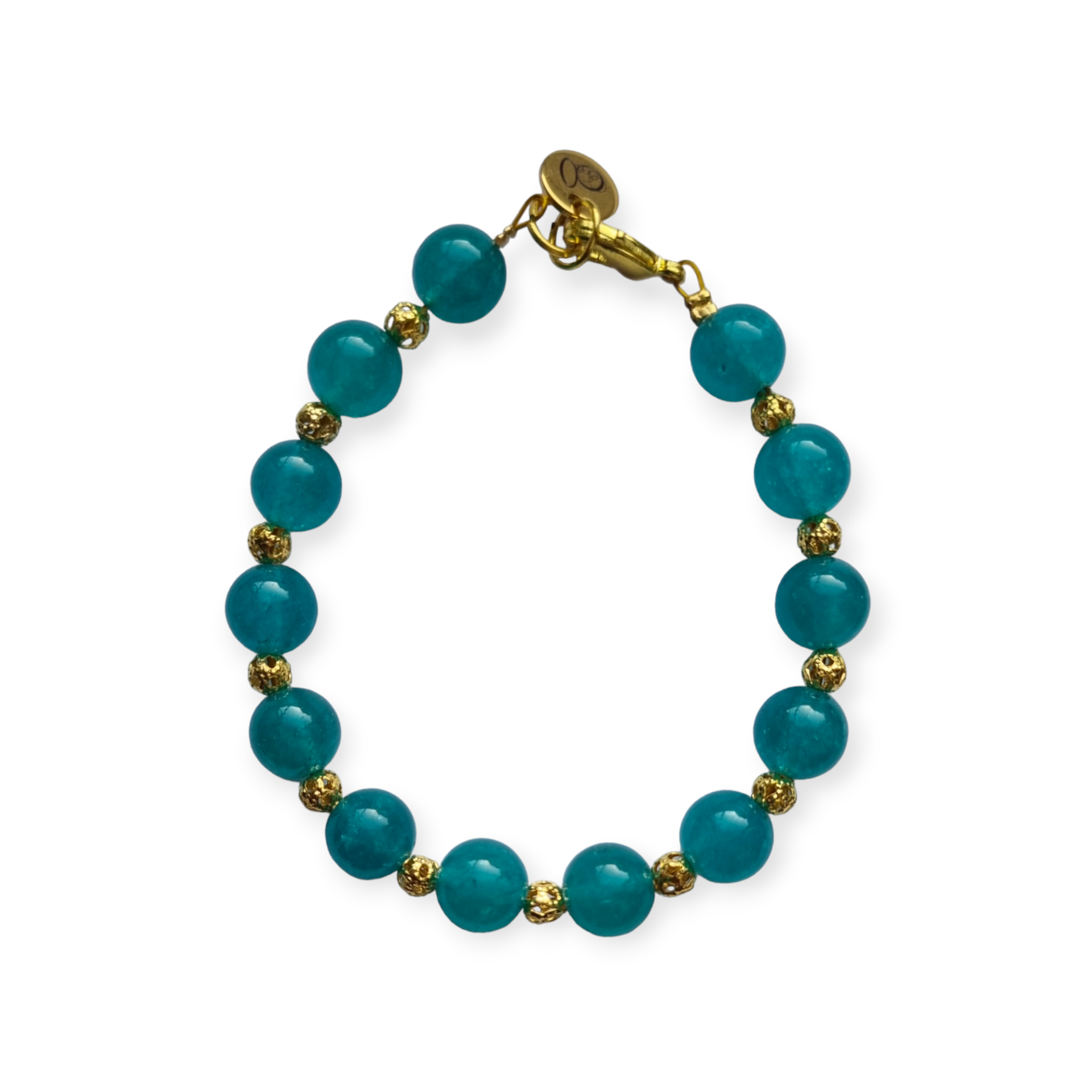 Prachtige vergulde armband van Malachiet kralen 8 mm en vergulde bewerkte kralen 4 mm. Evt. verkrijgbaar met verlengkettinkje. Lengte armband 18 cm.