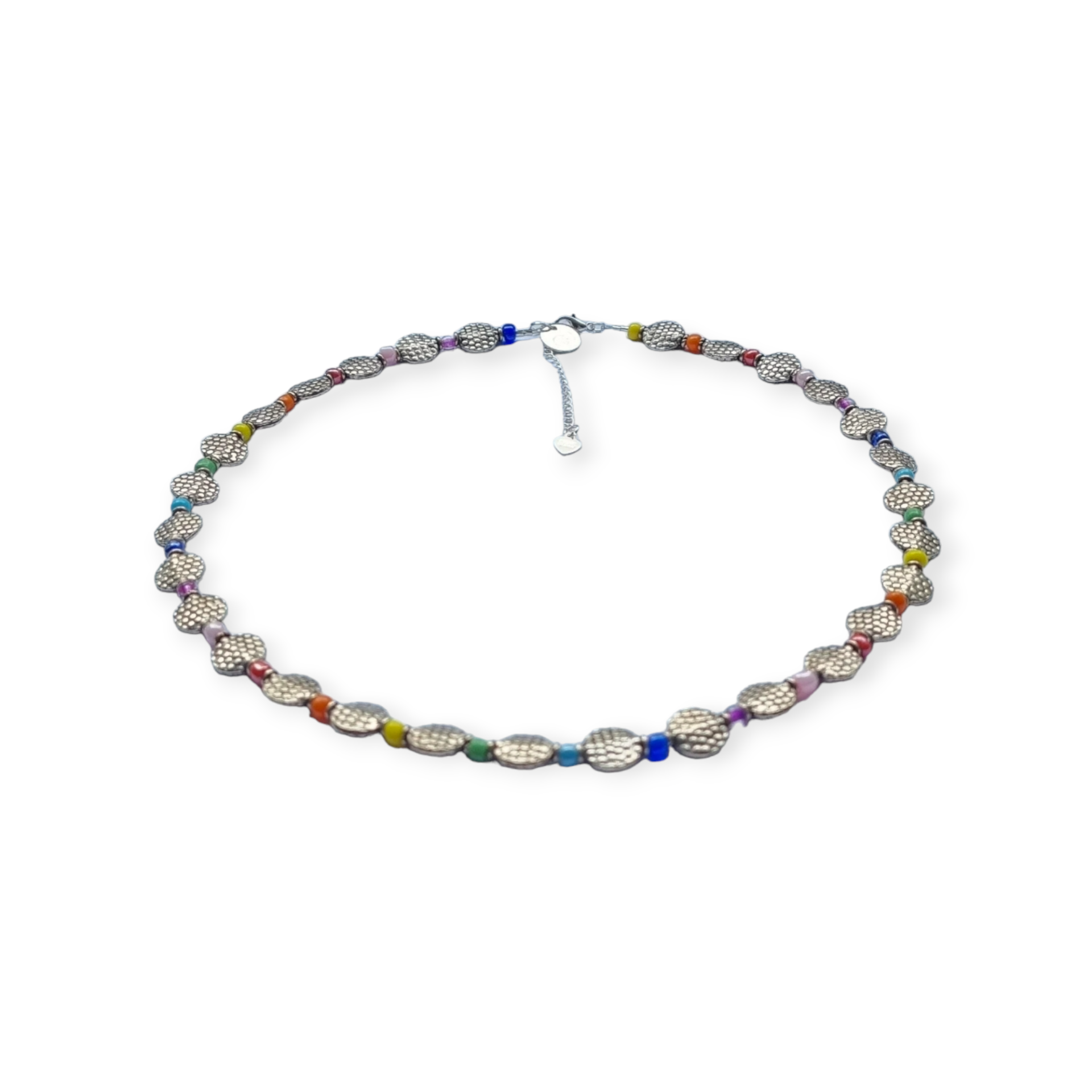 Prachtige ketting metal look met rocailles in regenboogkleuren afgewerkt met een zilveren (925) met verlengkettinkje.