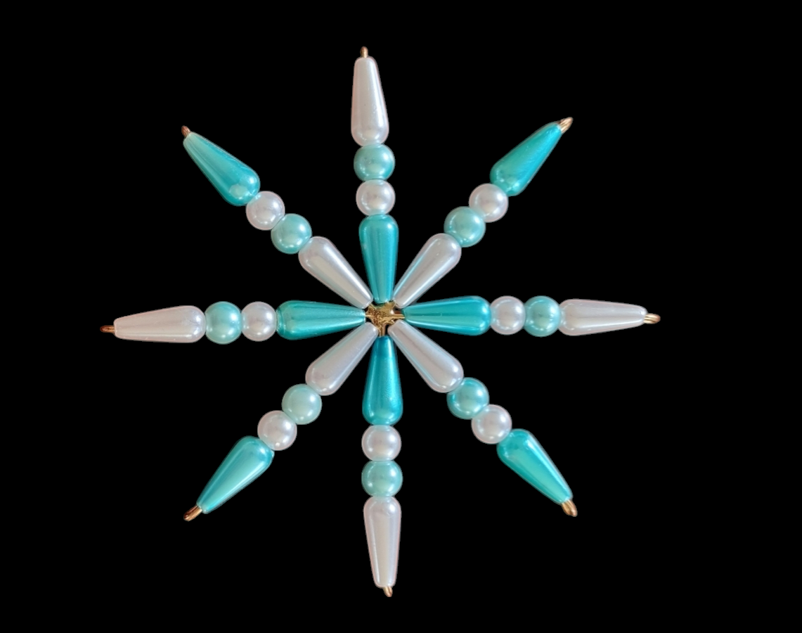 Prachtige kerstster wit-aqua. Leuk voor in de kerstboom. Materiaal metaal, kunststof parels -en kralen. Afmeting ca. 9 cm.