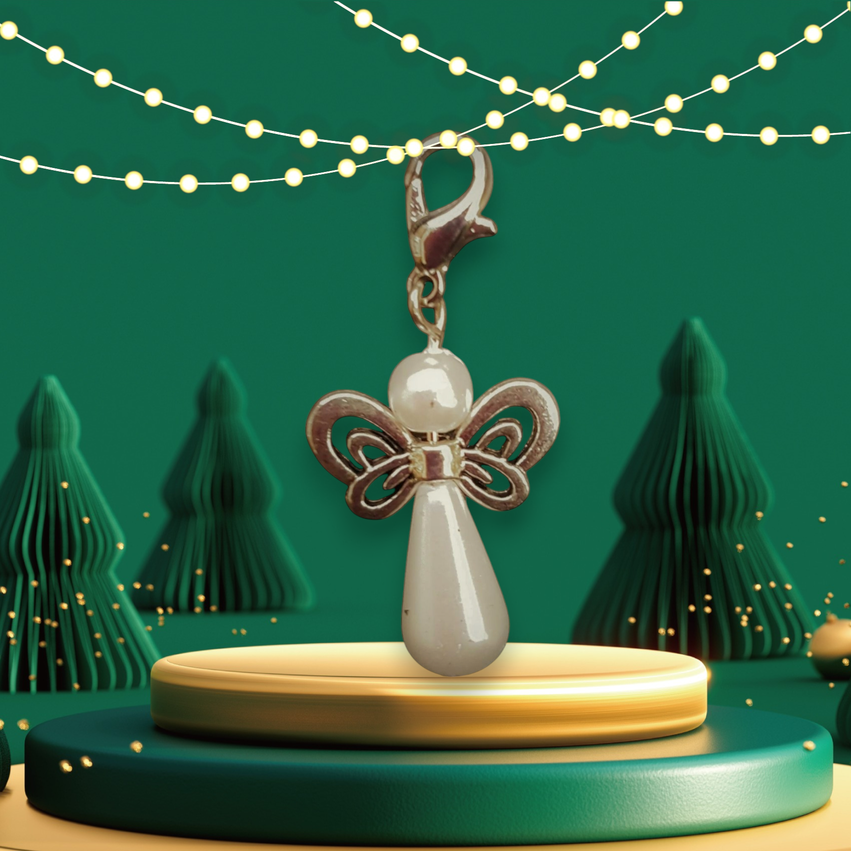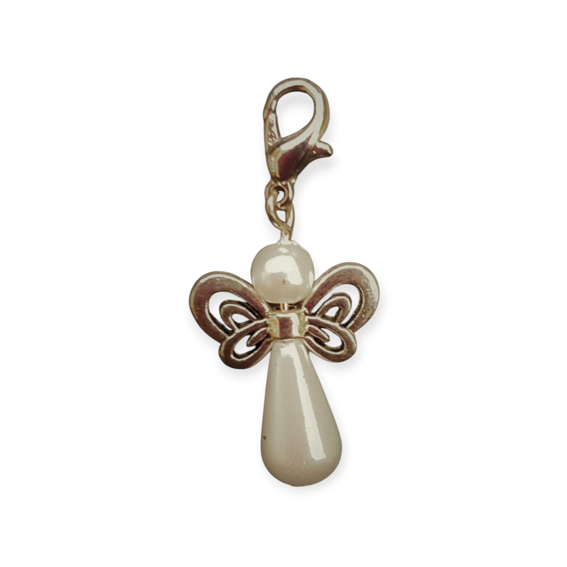 Prachtig wens engeltje / beschermengeltje vlindervleugel zilverkleur met druppel wit en slotje. Leuk om aan een tas te hangen.