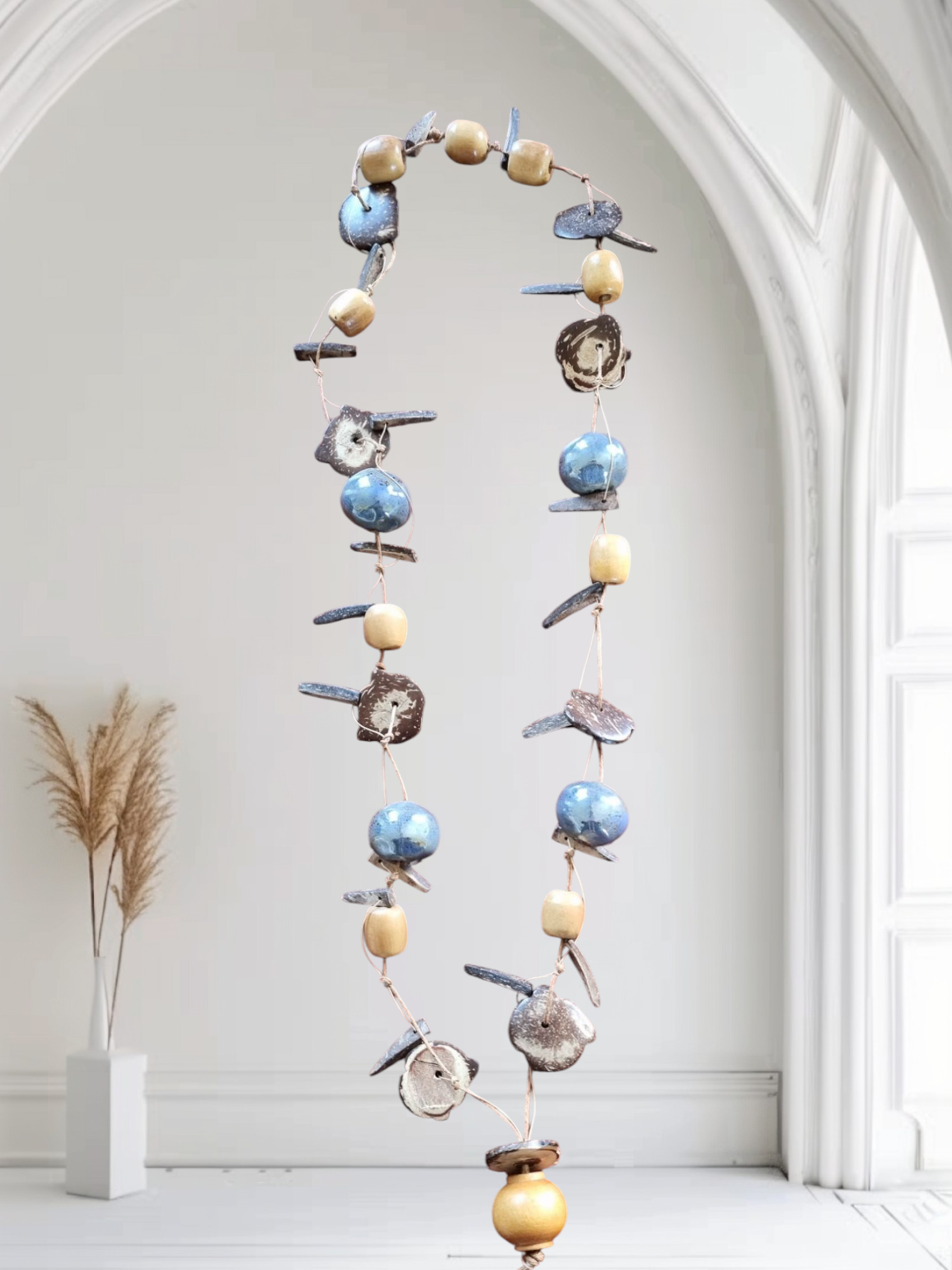 Prachtige geknoopte ketting van hout en luxe blauw keramiek. Lengte van de ketting is ca. 50 cm.