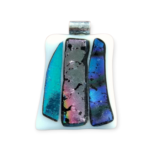 Prachtige rechthoekige glashanger dichroic, in blauw en paarstinten met witte achtergrond.
