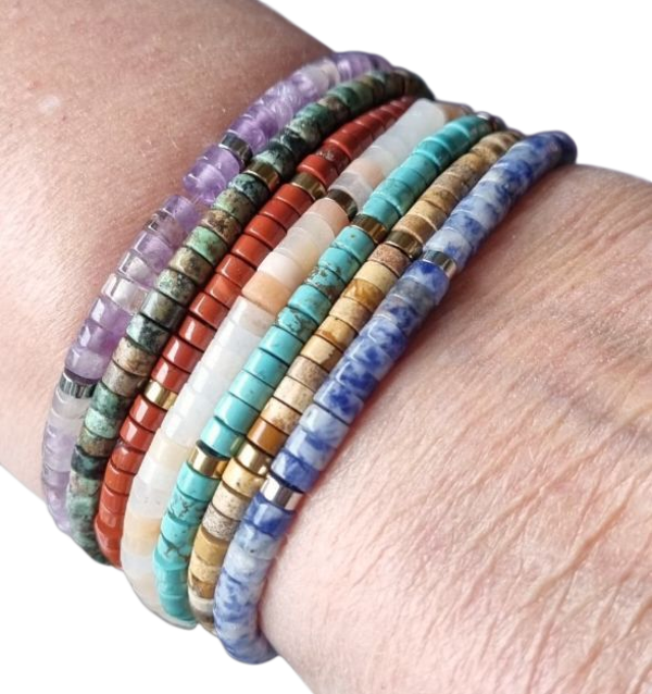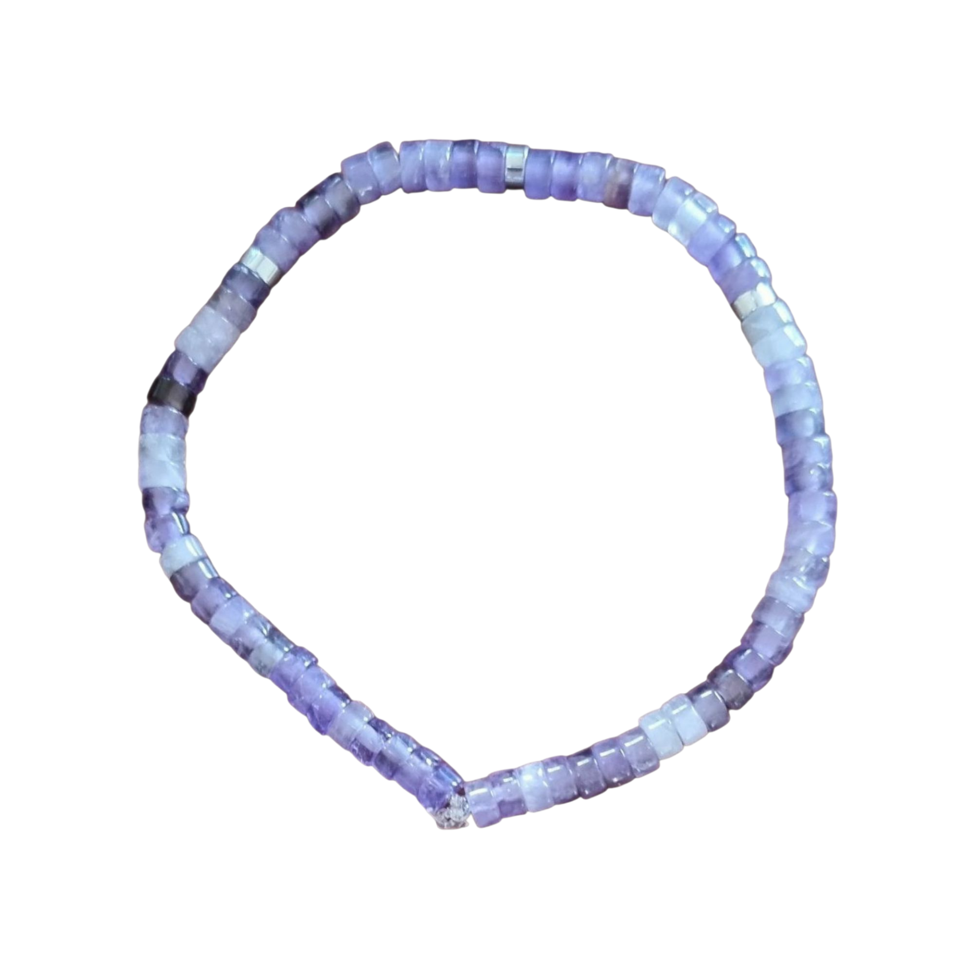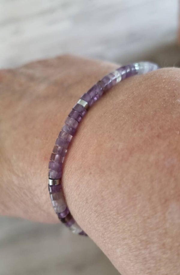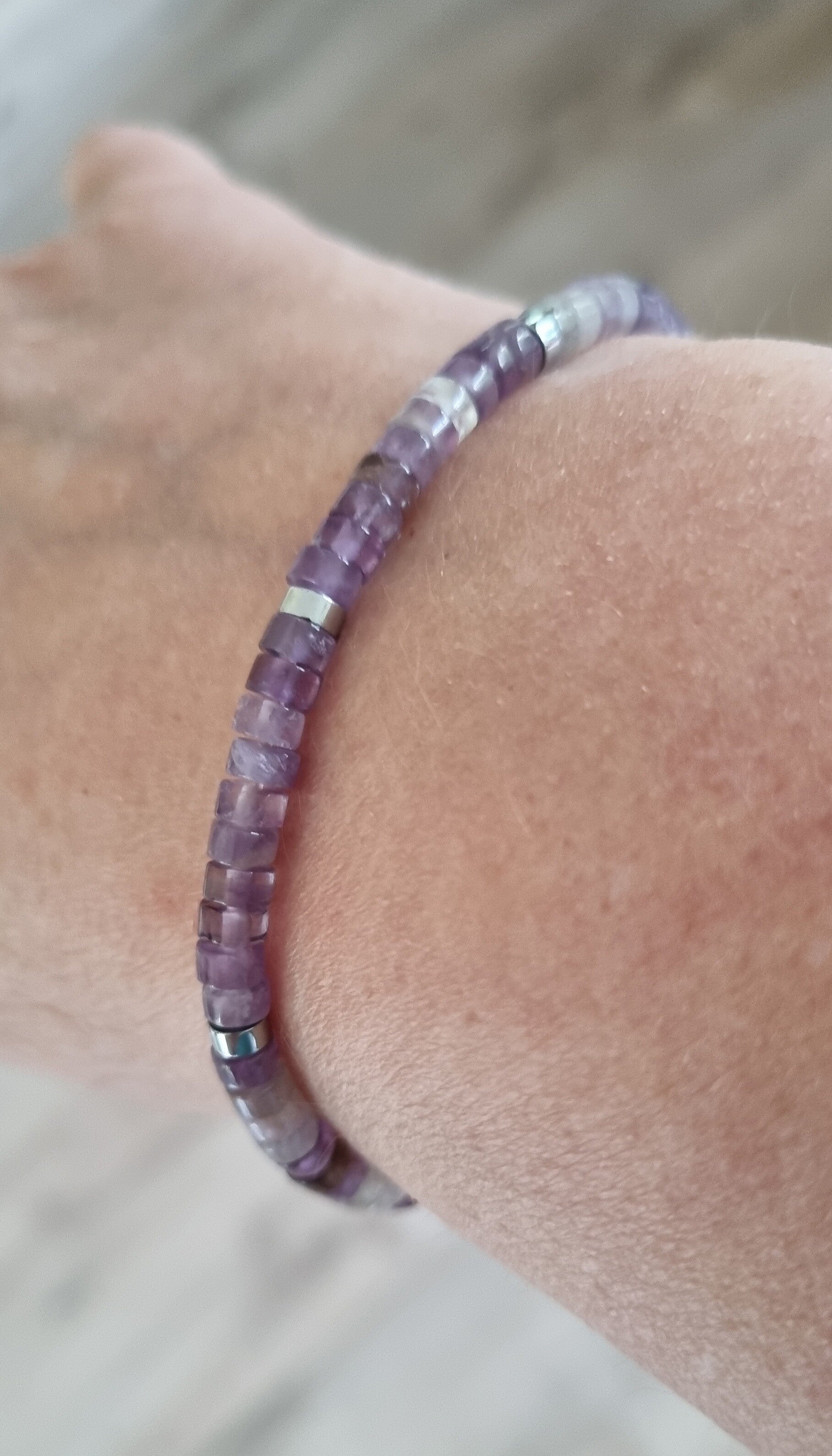 Prachtige armband Amethist op elastiek met zilverkleurige hematiet accenten. Lengte armband ca. 19 cm, dikte 4 mm.