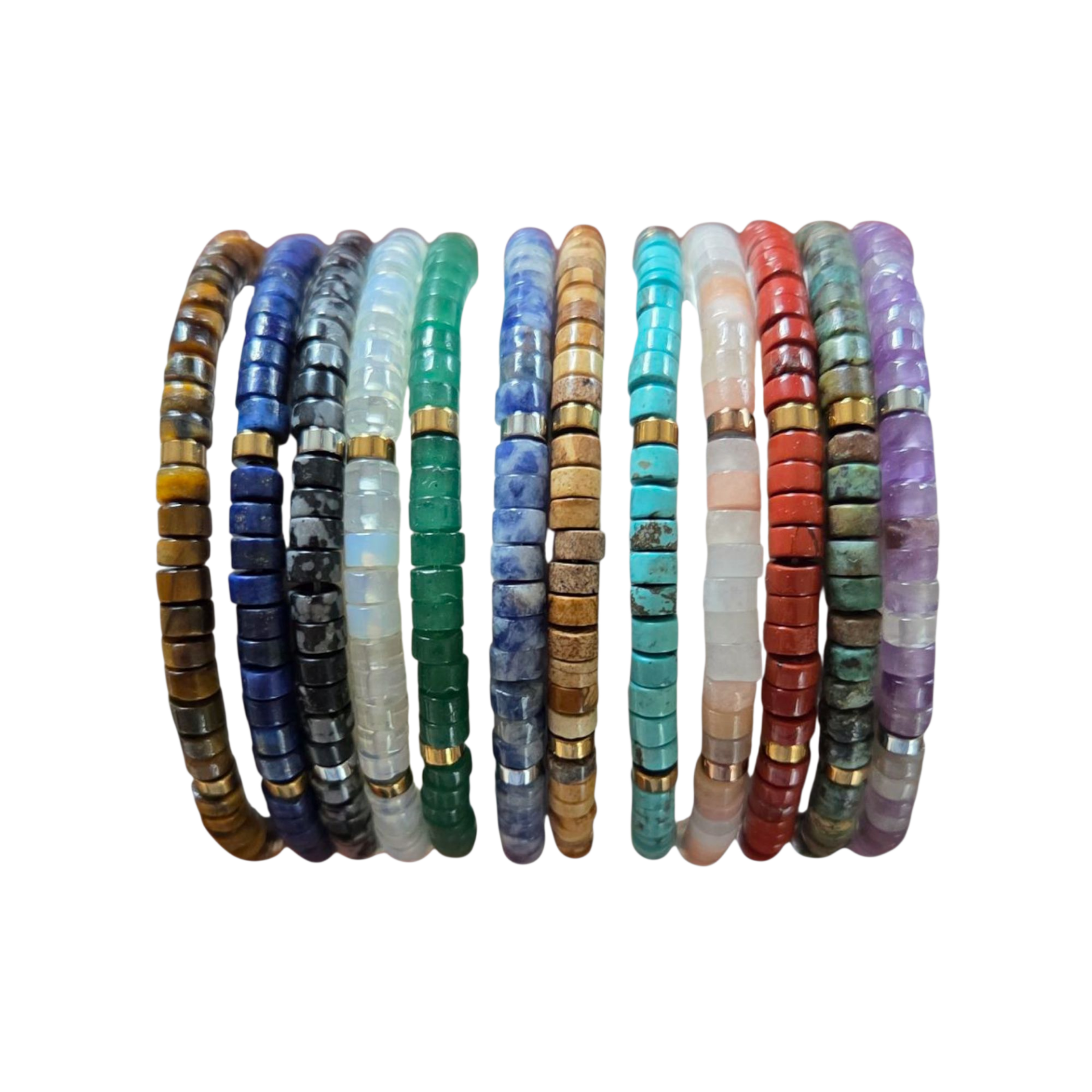 Prachtige Aventurijn armband op elastiek in prachtige kleuren met goudkleurige hematiet accenten. Lengte armband ca. 19 cm, dikte 4 mm.
