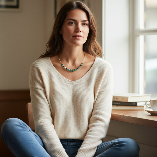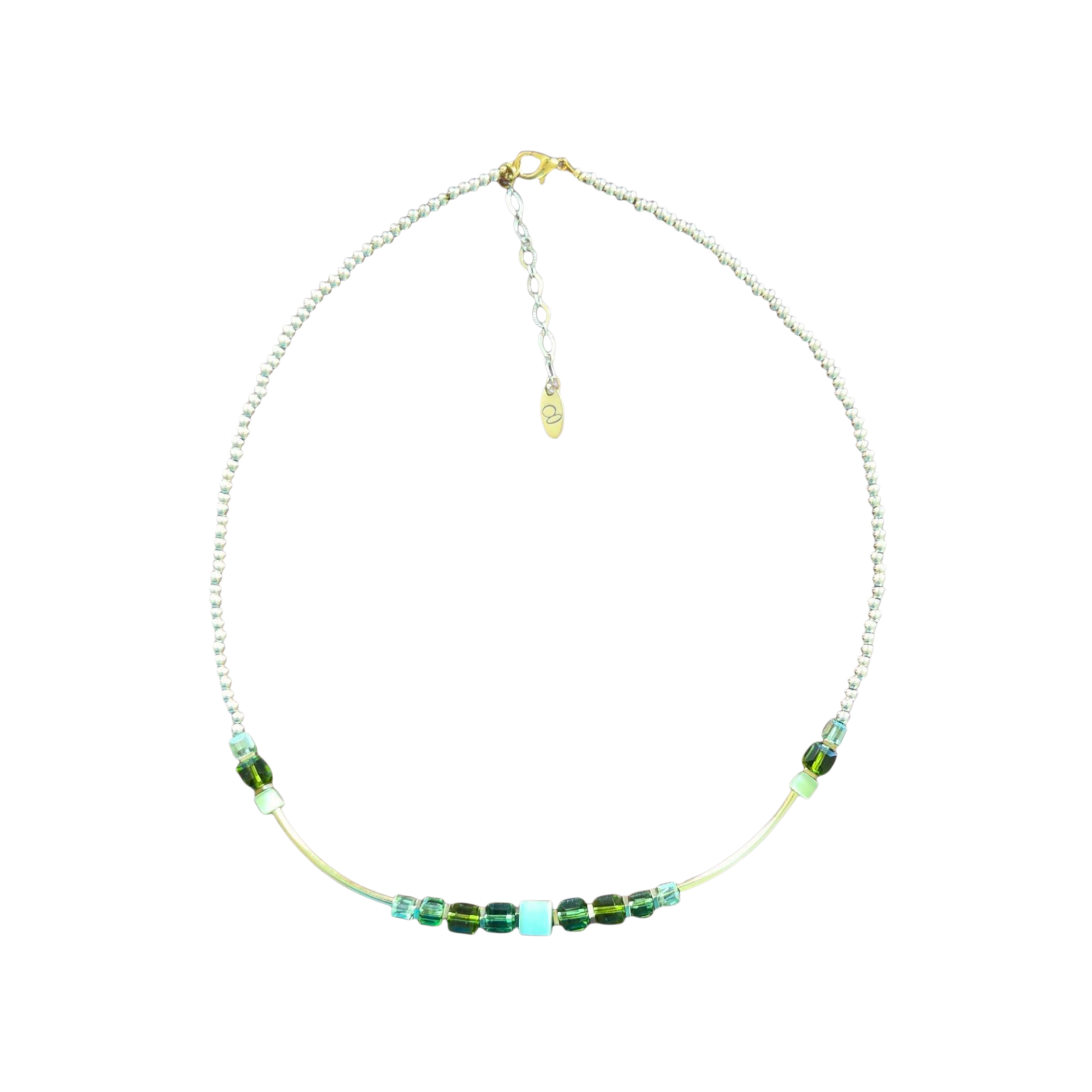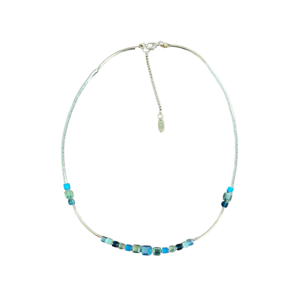Prachtige blauwgroene blokjesketting Isabel, cube necklace, blauwe en groene glas blokjes, doorschijnend facet geslepen en mat, messing buizen en spacers afgewisseld met hematiet en afgewerkt met goldplated sluiting met rvs verlengkettinkje. Lengte ketting 45 cm, verlengkettinkje 5 cm. Totale lengte ketting 50 cm.