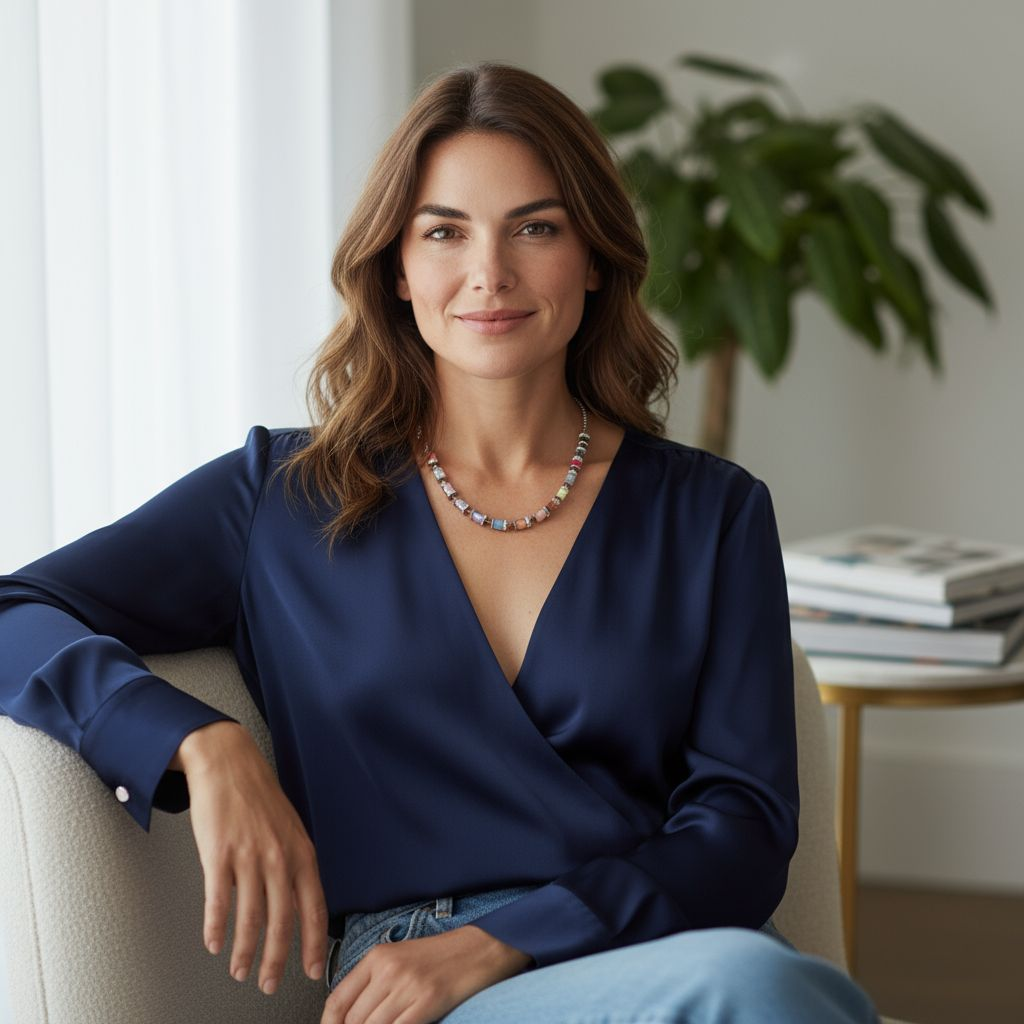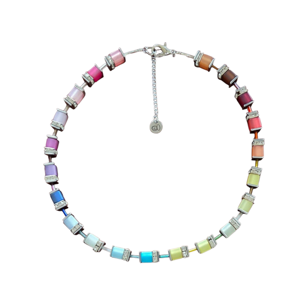 Prachtige blokjesketting van polaris kralen regenboog met glasstiften, hematiet en strass zilverkleur met verlengkettinkje. Blokjes 8 mm.