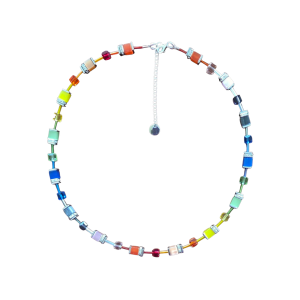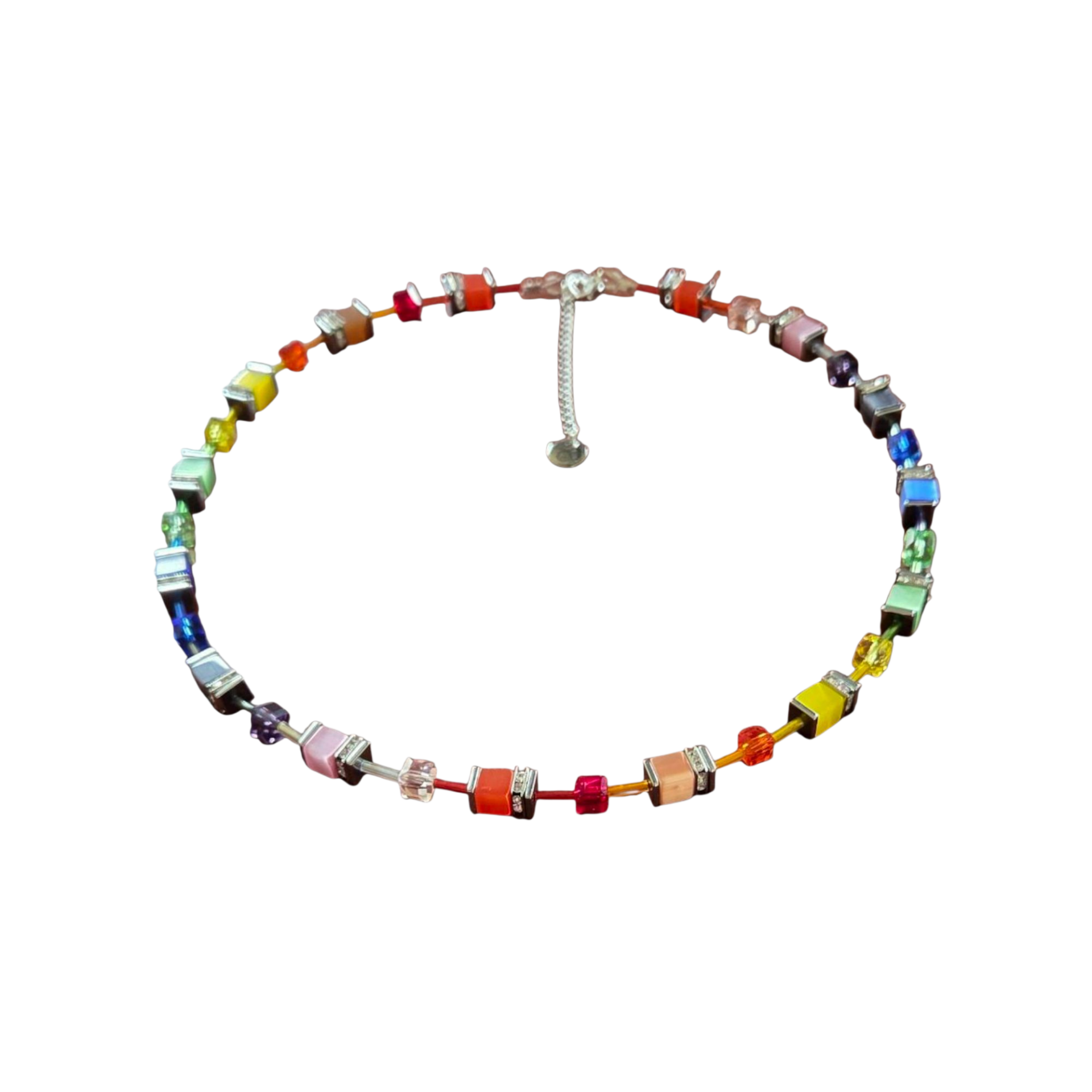 Prachtige blokjesketting van glaskralen regenboog met glasstiften, glasblokjes, hematiet en strass met verlengkettinkje. Blokjes 6 mm.