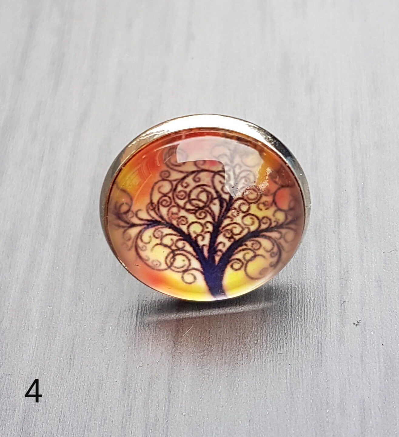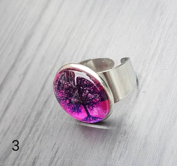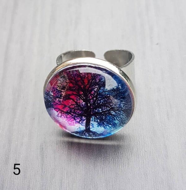 Prachtige ring rvs verstelbaar met cabochon met afbeelding levensboom. In diverse kleuren.