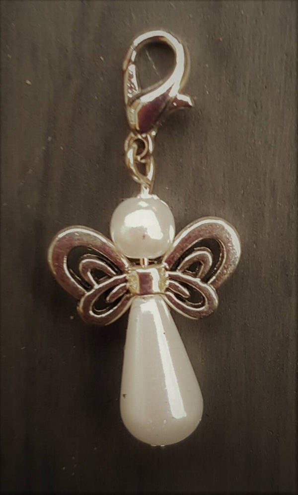 Wens engeltje / bescherm engeltje zilverkleurig met witte parel druppelvorm