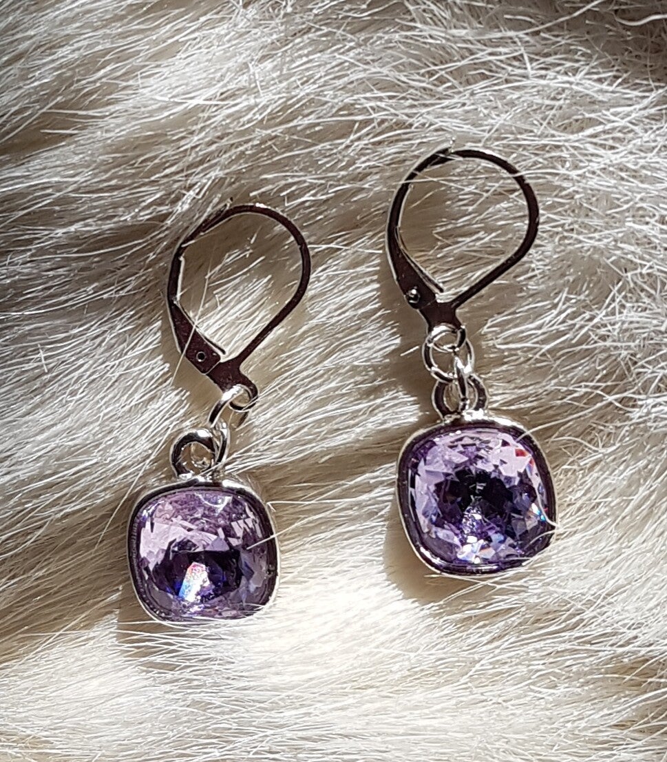 Design klapoorbellen swarovski paars met zilveren oorhangers. Steen 10 mm.