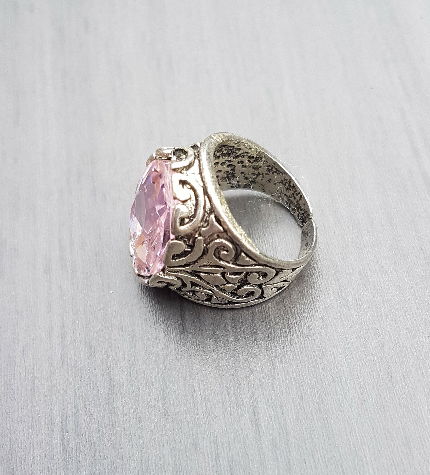 Prachtige ring verstelbaar antiek zilverkleur met facetsteen roze