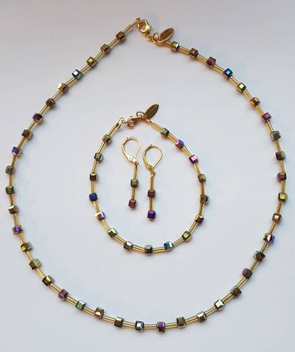 Prachtige sieraden set hematiet met glasstaafjes in goudkleur, bestaande uit een ketting, een armband en oorbellen.
