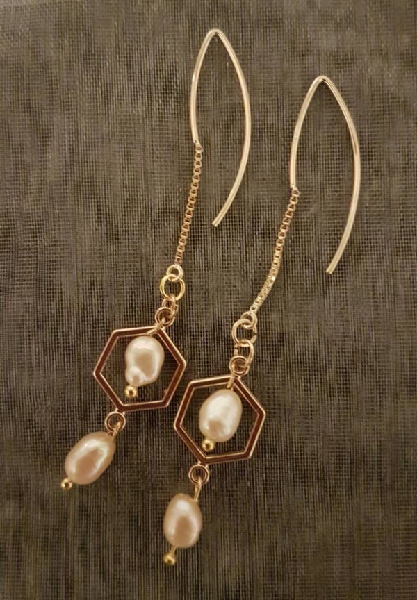 Prachtige vergulde oorhangers met connectors en roze parels.