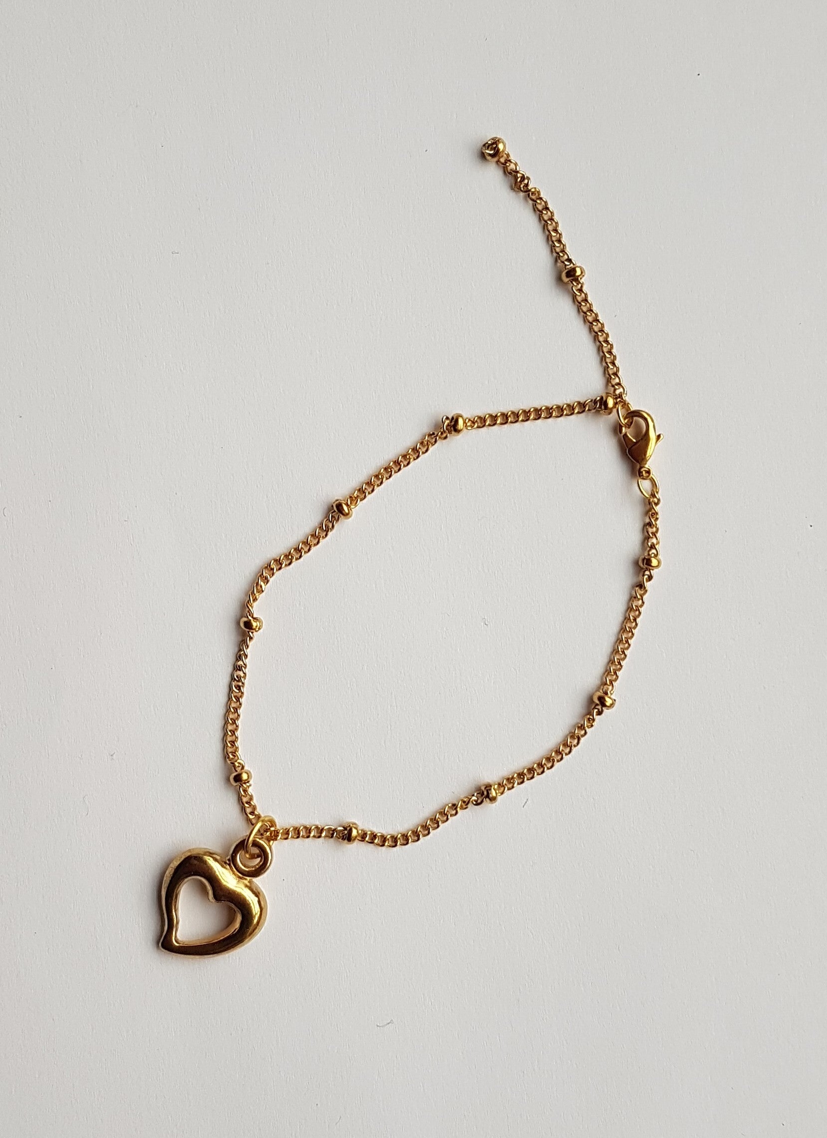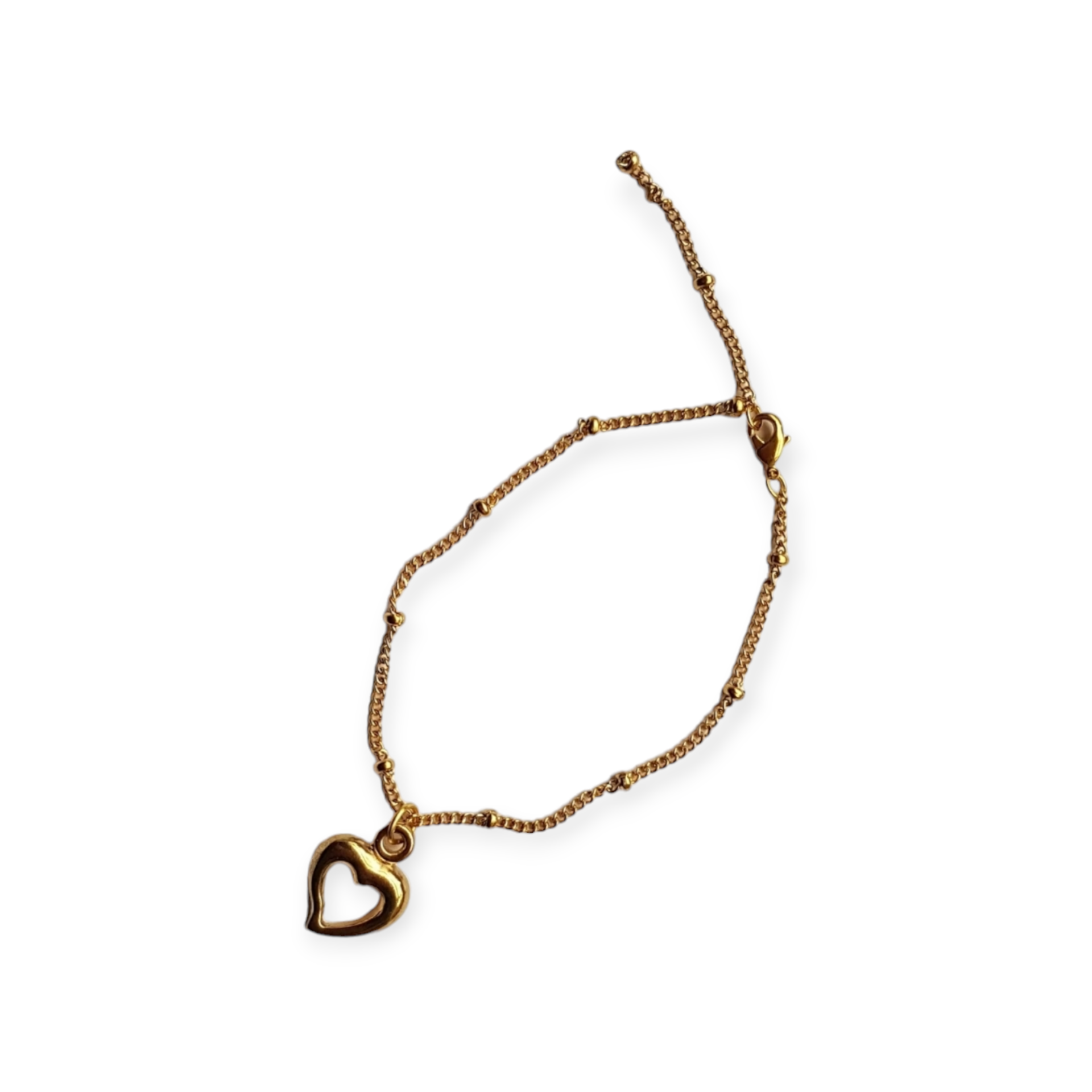 Prachtig fijn goudkleurig schakelarmbandje met verlengkettinkje met bolletjes en hartje. Kadotip voor Valentijnsdag of Moederdag.