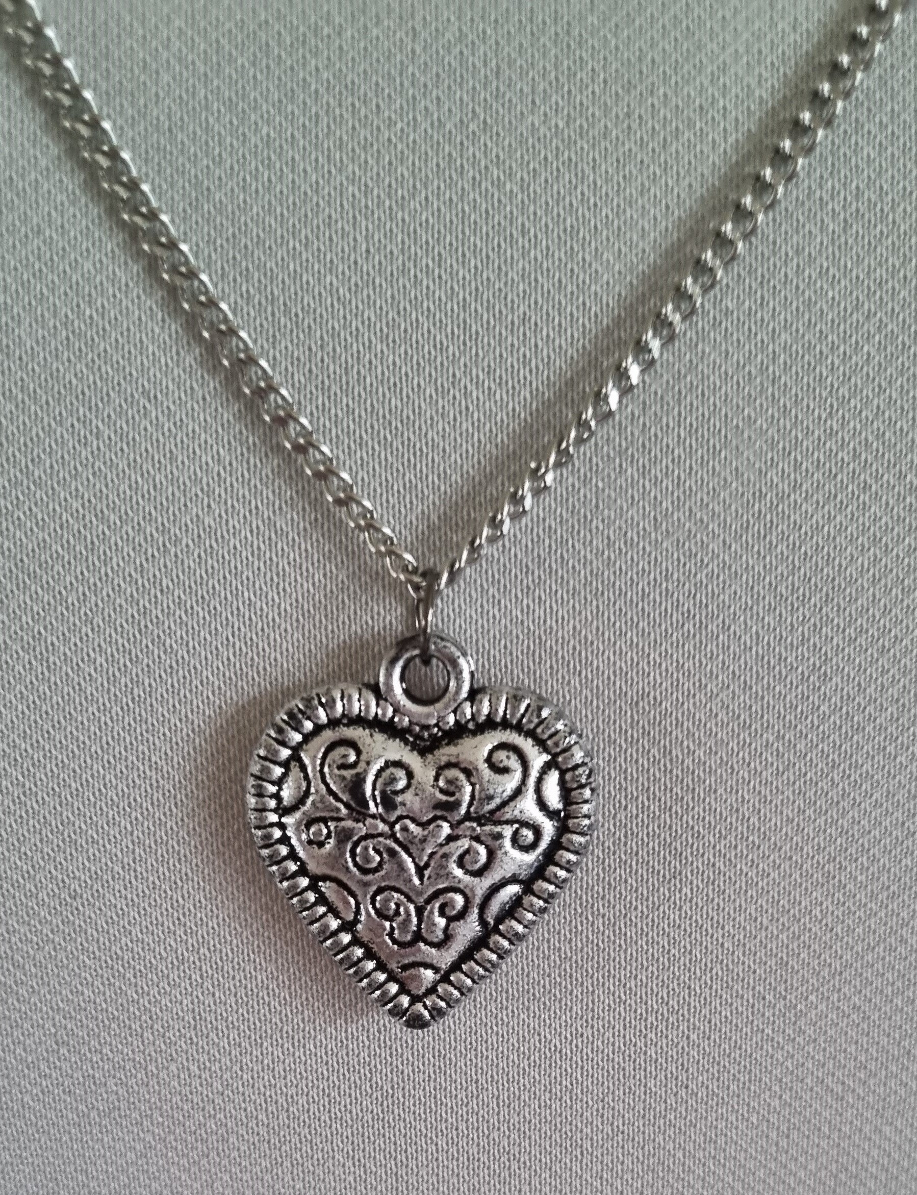 Prachtig kettinkje met bewerkt zilver hartje. Kettinkje kan in 45, 65 en 80 cm mogelijk, hart 22 mm. Leuk voor Valentijnsdag of Moederdag. Ook in antiek zilver kettinkje verkrijgbaar 65 cm.