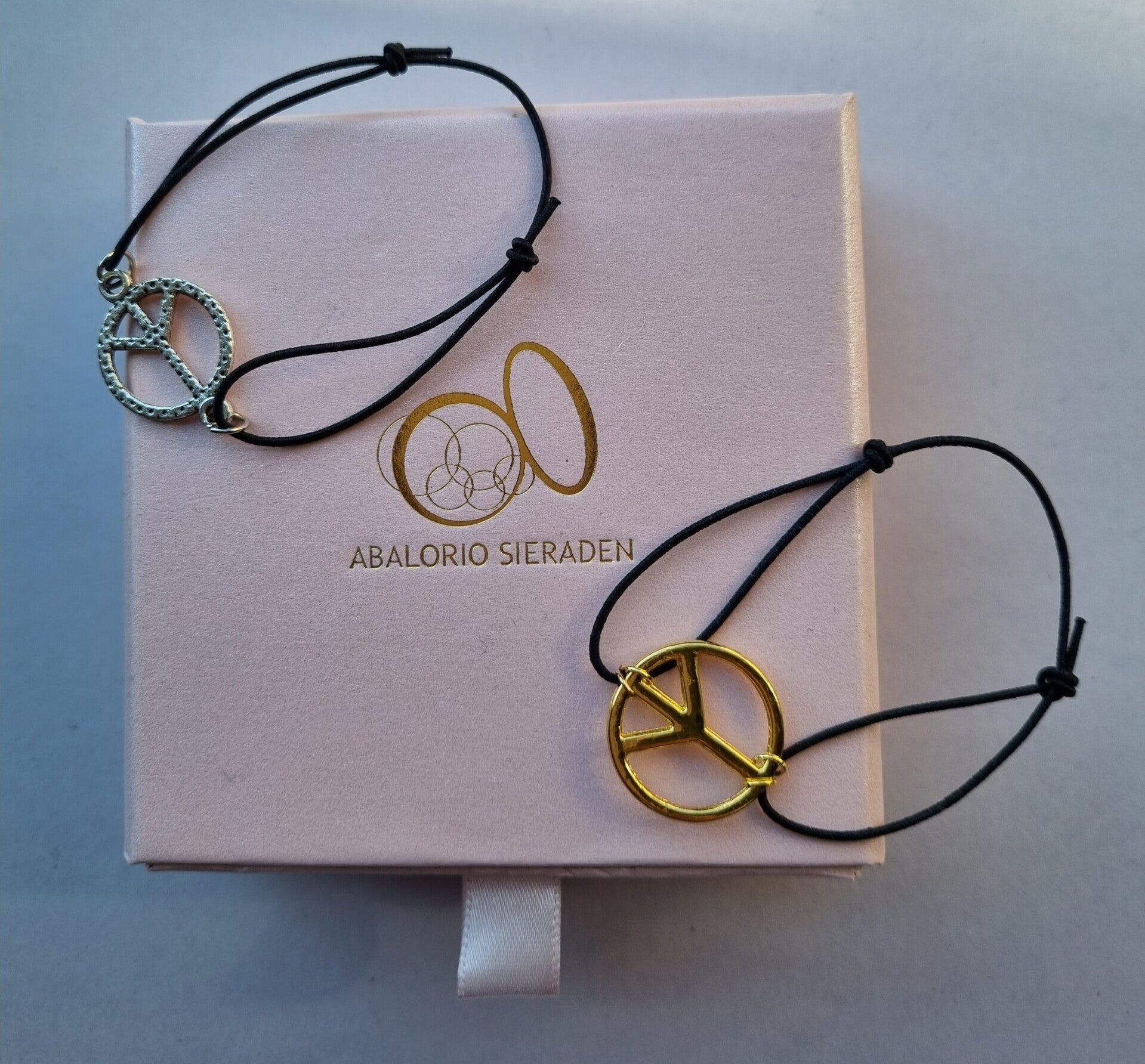 Leuke armband van zwart elastiek met peace teken goud of zilver.