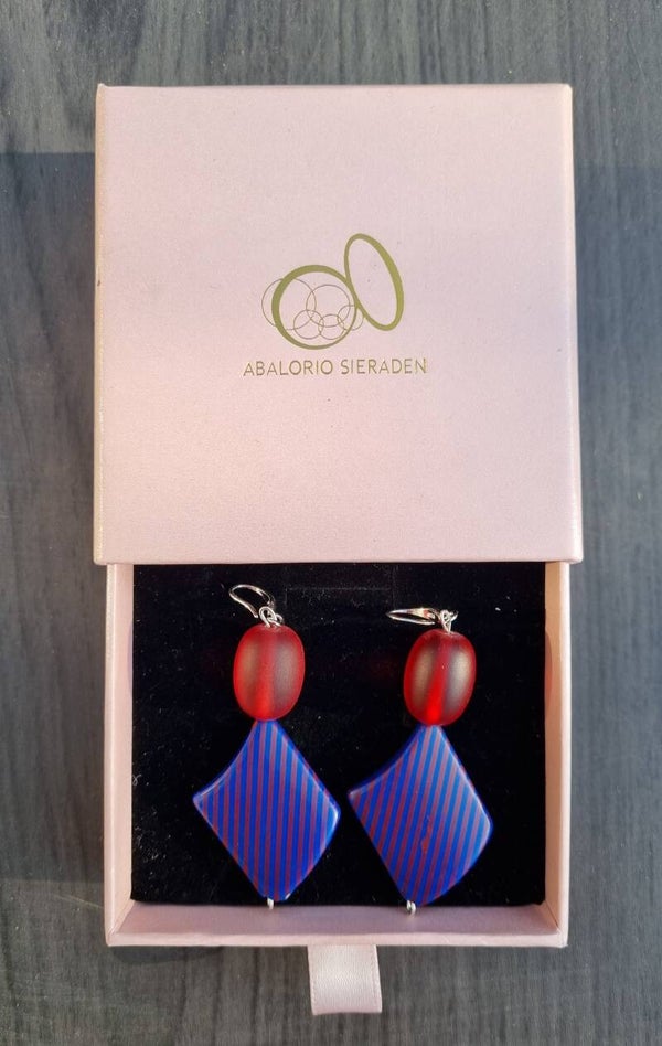 Zilveren oorhangers groot kunststof blauw-rood gestreept