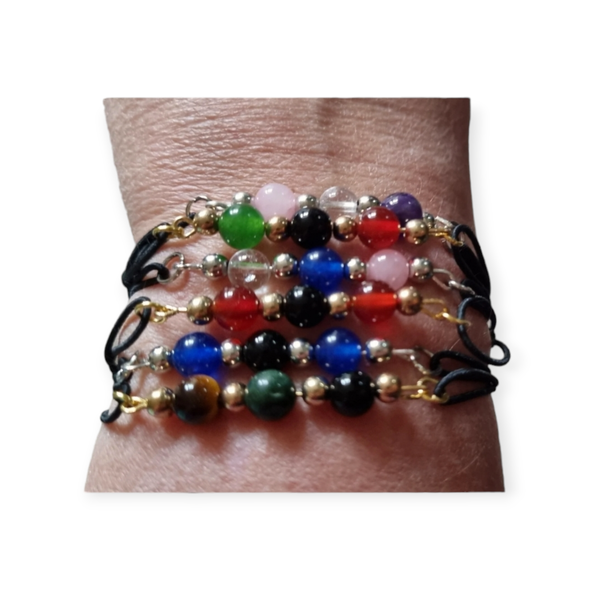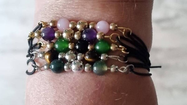 Leuke verstelbare armband op elastiek met jade en zwart agaat met goudkleurige kralen.