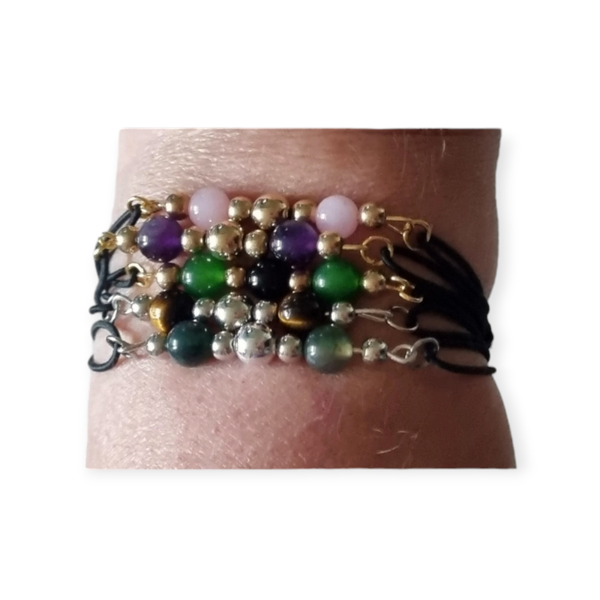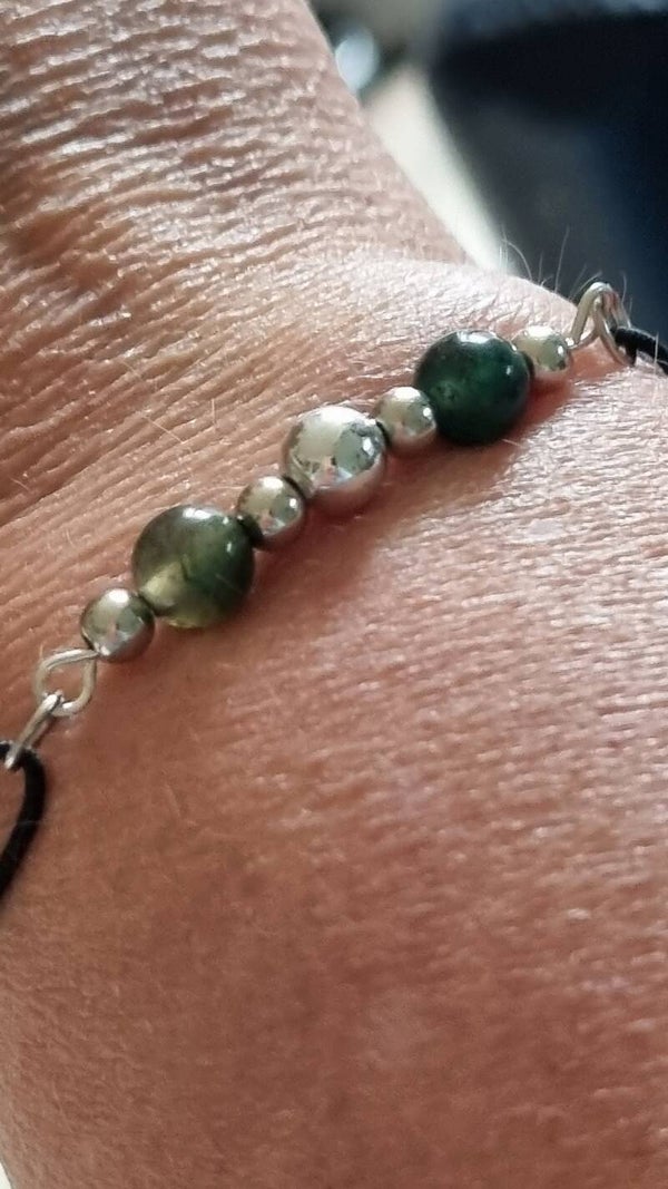 Leuke verstelbare armband met groen agaat met zilverkleurige kralen.