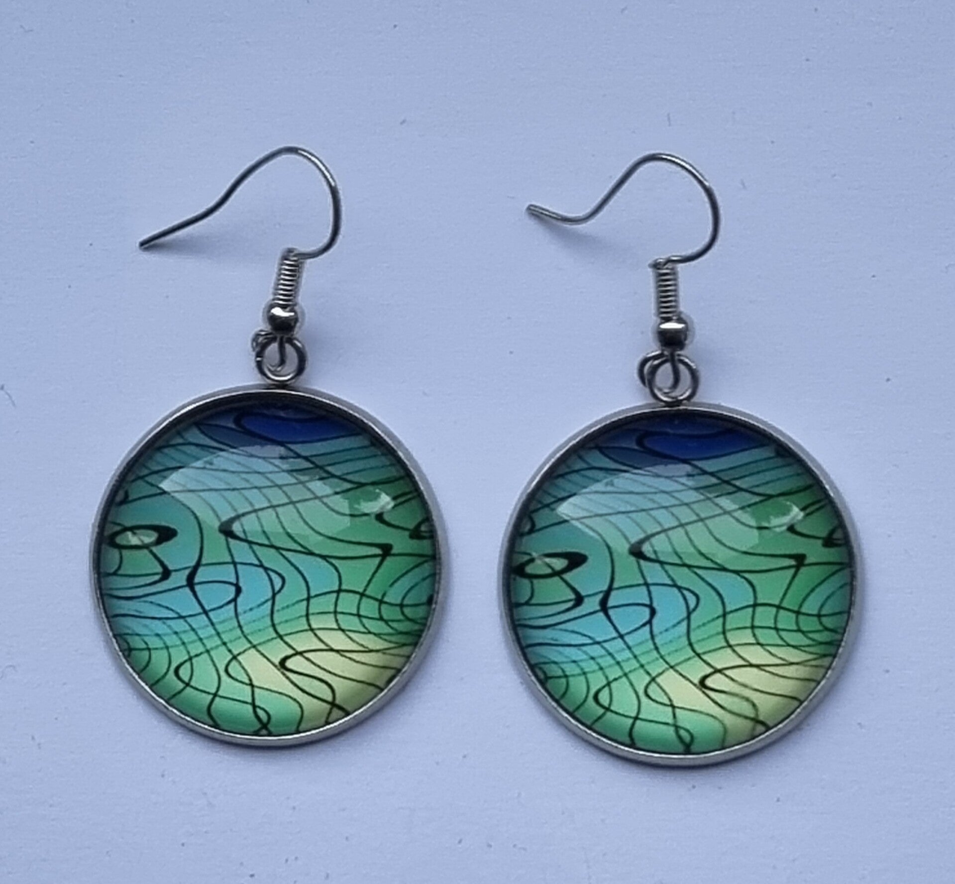 Prachtige oorhangers met kleurrijke cabochon 25 mm in blauw eb geek en verschillende kleuren groen.