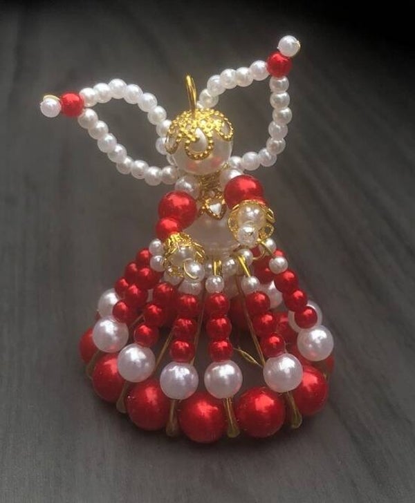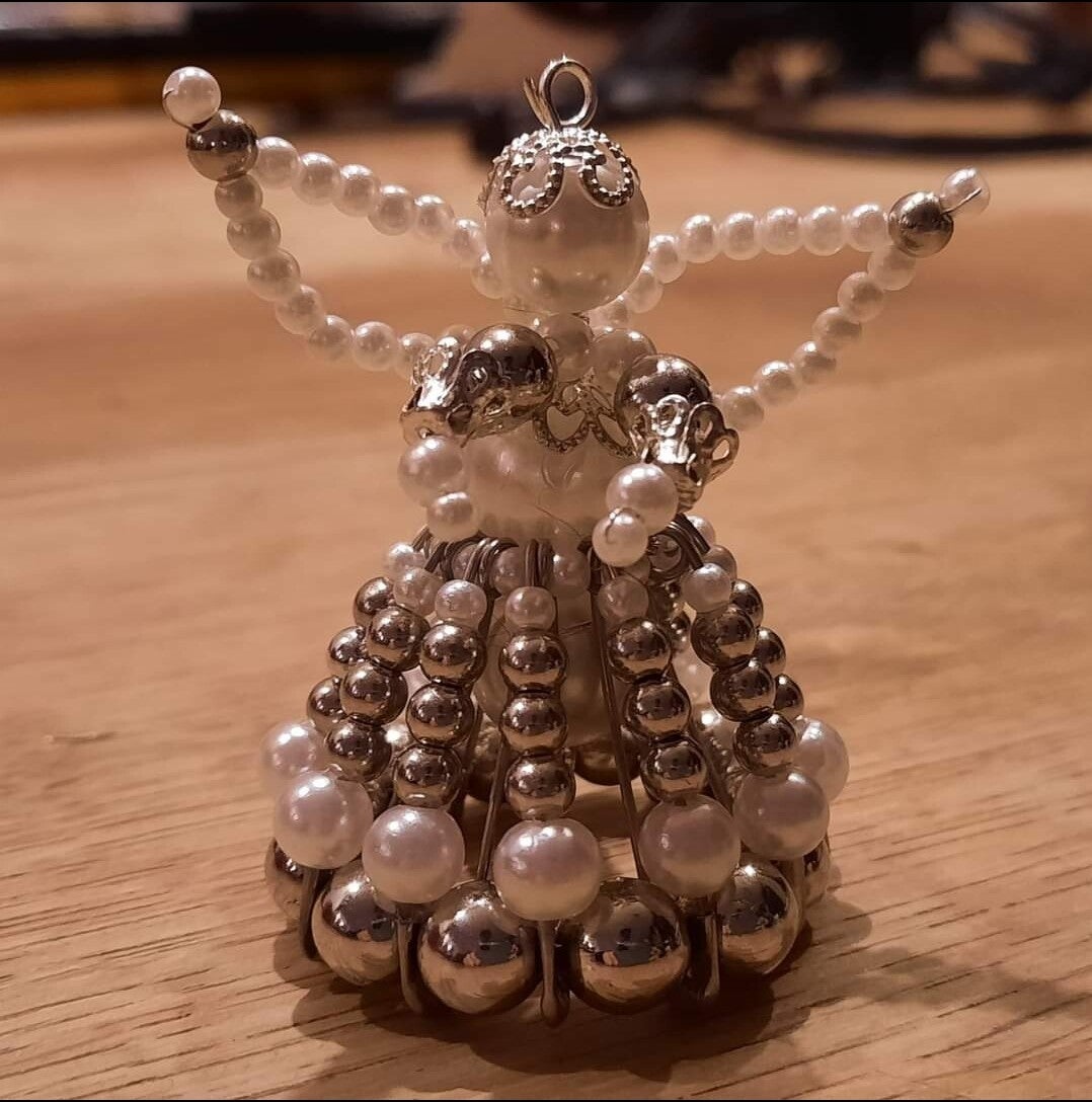 Prachtig handgemaakt kerstengeltje van parels met mooie filigrain kapjes. Een mooie kerstdecoratie voor in de kerstboom, schoorsteenmantel of in het raamkozijn. In zilver-wit, zilver-rood, rood-wit-zilver, goud-wit, goud-rood en rood-wit-goud. Mocht de gewenste kleur of een andere kleur niet op voorraad zijn, neem dan contact op via 06-53697829 bij voorkeur whatsapp of abaloriosieraden@gmail.com. Dan maak ik het op bestelling. Ook mogelijk in cadeauverpakking (zie uittrekmenu verzending)